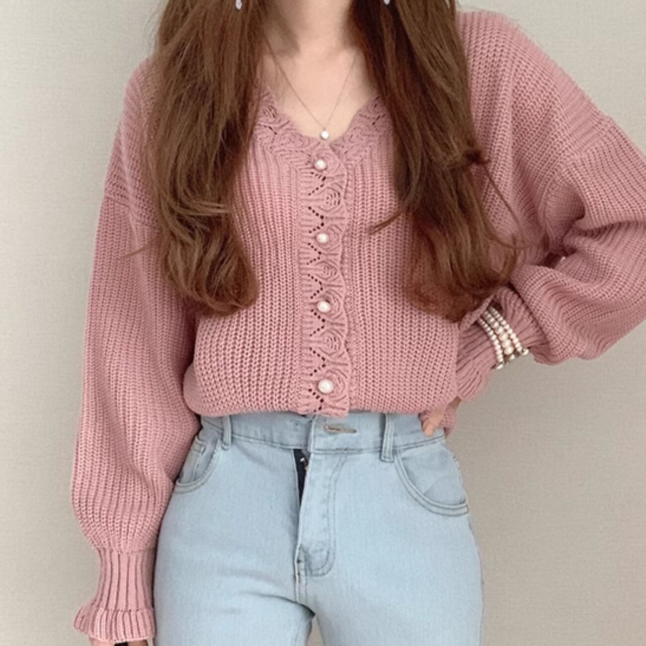 Vネックフリルニットカーディガン 200073