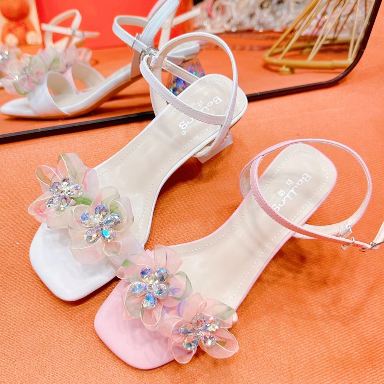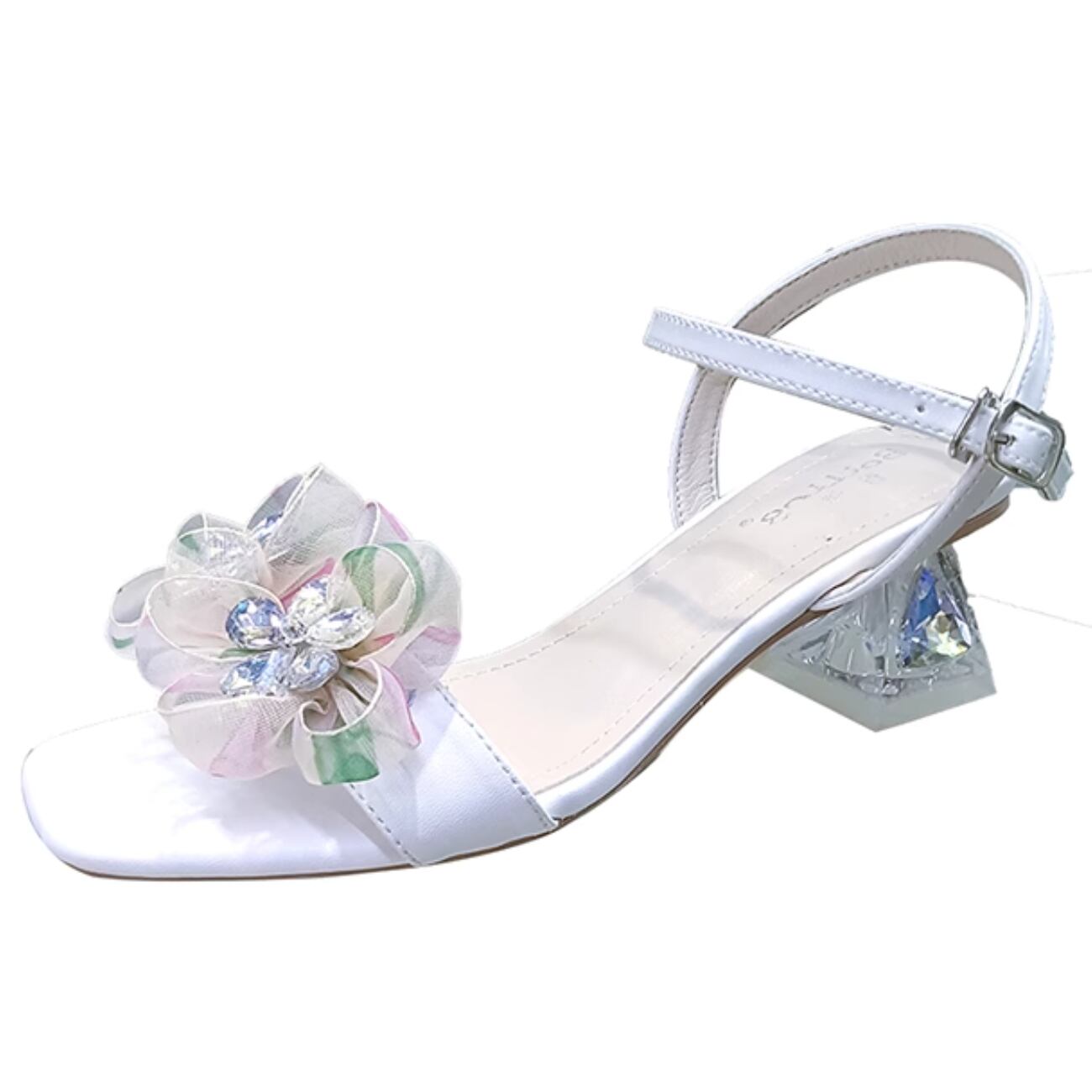 夏の装いにぴったりの透明感のあるデザインと花のモチーフが特徴の一足です。軽やかなストラップが足元を涼しげに演出し、華やかな花のディテールが女性らしさを引き立てます。