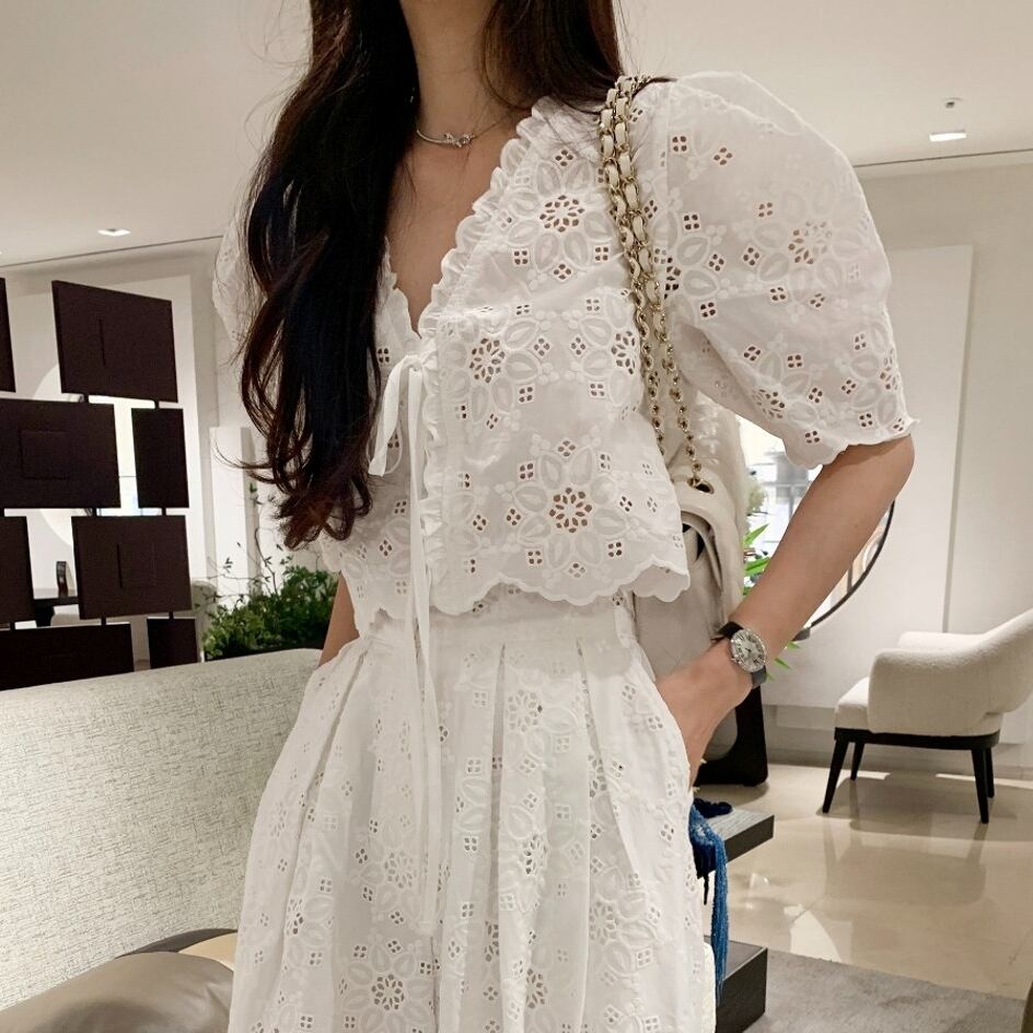 フェミニンな魅力が詰まった一着です。繊細なアイレット刺繍が施されたデザインは、軽やかで優雅な印象を与えます。Vネックがデコルテを美しく見せ、女性らしさを引き立てます。