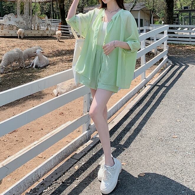 シアーケープトップス&ショートパンツセットアップ 2405192
