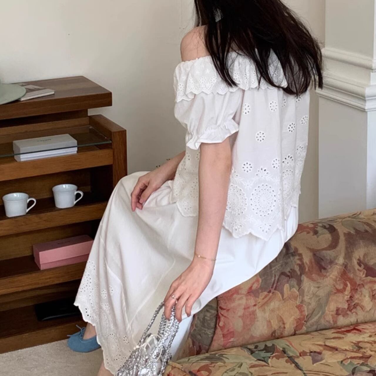 オフショルダーかぎ針編みブラウススカートセットアップ 2405227