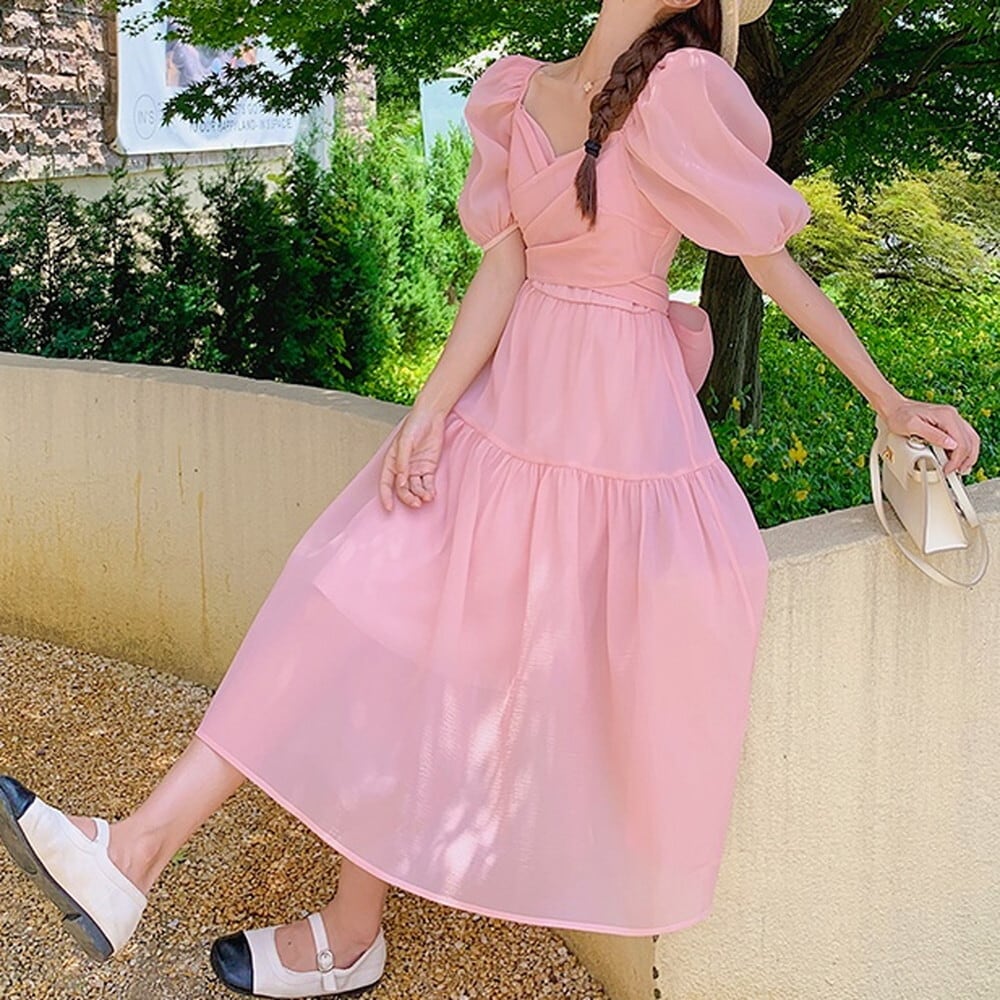バックに繊細なリボンが飾られ、華やかなバルーン袖が印象的なフェアリーロングワンピース。