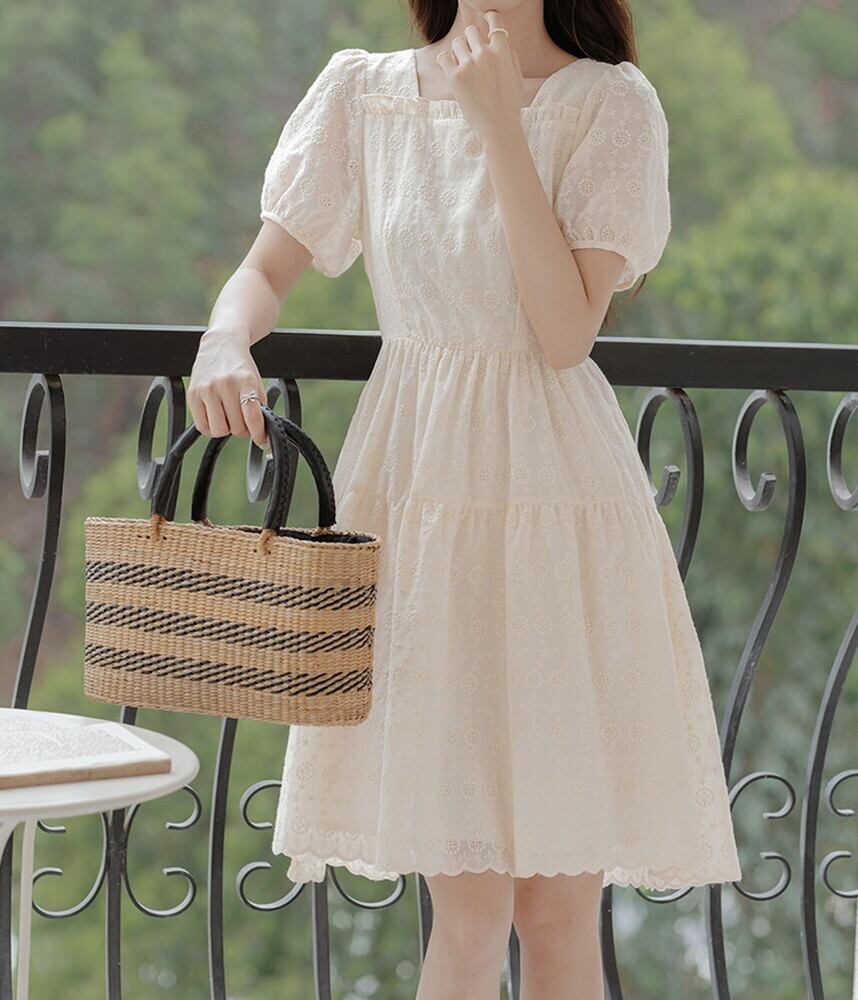 パフスリーブパンチングスカラップワンピース 240605