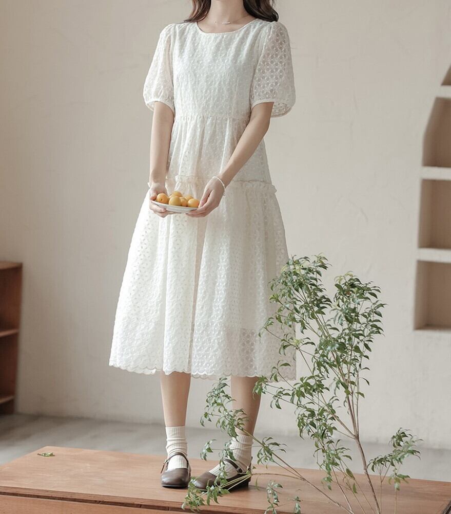 軽やかで華やかなワンピース。パンチング加工が施され、エレガントでフェミニンな雰囲気を演出します。ふんわりと広がるシルエットが女性らしさを引き立て、快適な着心地を提供。デイリーから特別な日まで、さまざまなシーンで活躍する一枚です。