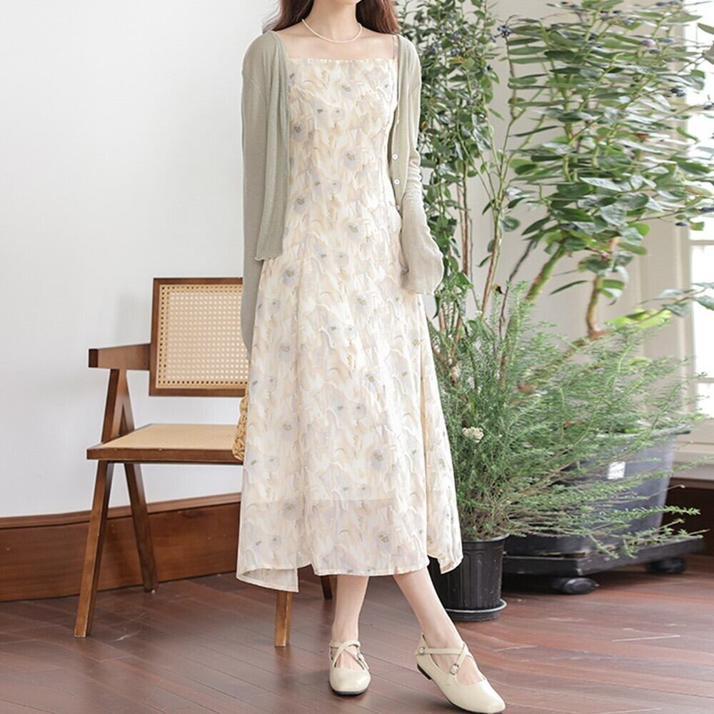 レトロ花柄シフォンキャミワンピース 240615