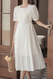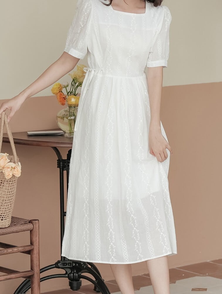 サイドに施されたドロストがポイントの花柄刺繍ワンピースは、シンプルながらも個性的なデザインが特徴です。花柄の刺繍が上品で華やかな印象を与え、デイリーカジュアルからリゾートでのお出かけまで、さまざまなシーンで活躍します。