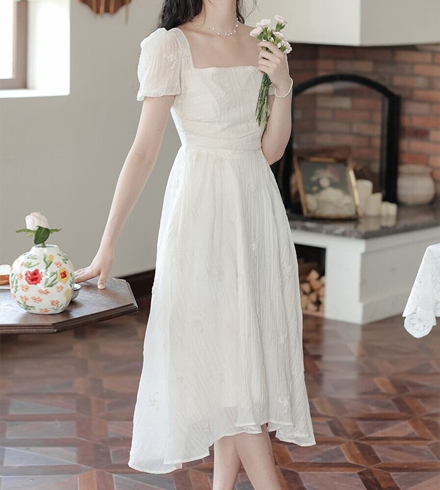 スクエアネックとパフスリーブが特徴のエレガントなワンピースです。デイリーにも特別な日でも着用可能なデザインです。